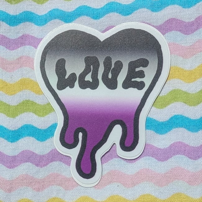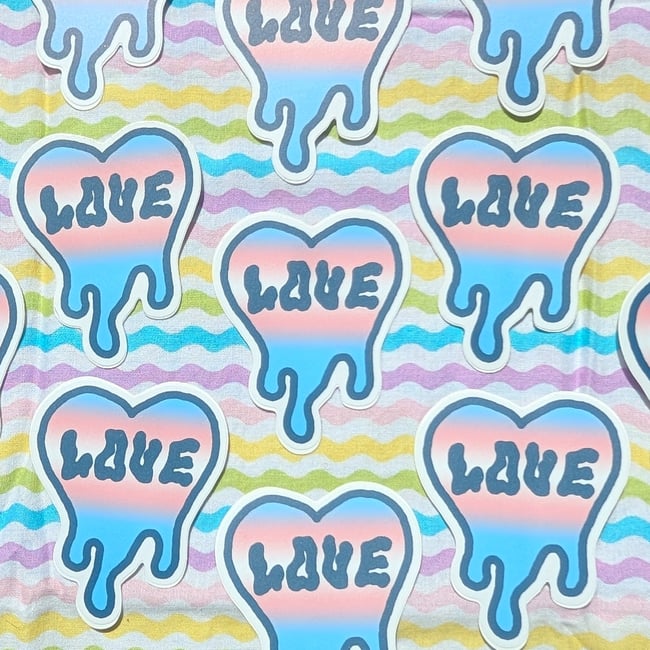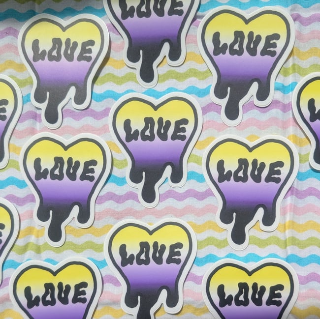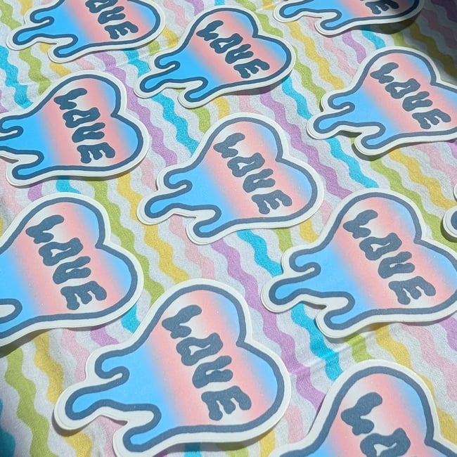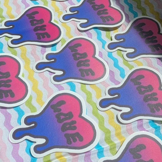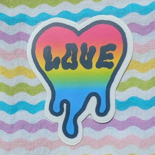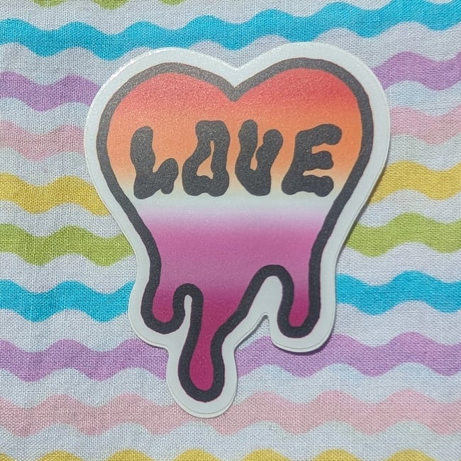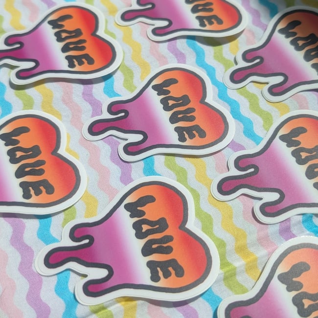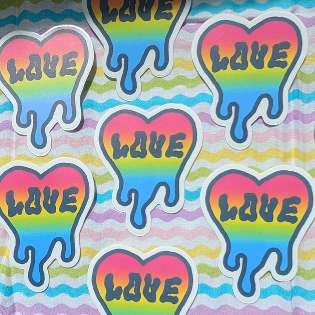 Holographic & holo glitter rainbow (pictured) & matte vinyl heart stickers, matte comes in a variety of pride flags including non-binary, lesbian, bisexual, pansexual, transgender and asexual, 3 in tall